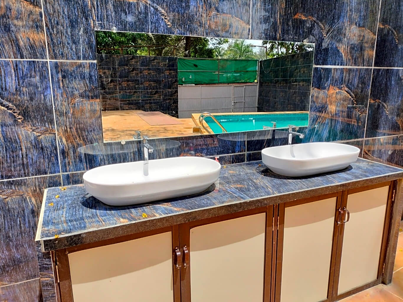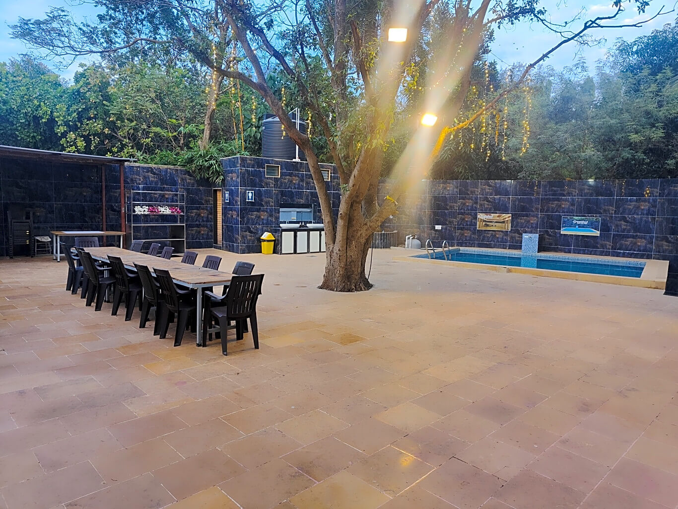 Outdoor space is tiled and has lawns. The outdoor pool and tiled space are a perfect settings for a barbeque and bonfire to enjoy the chilled night Yeoor weather. It also has a outside sitout area.