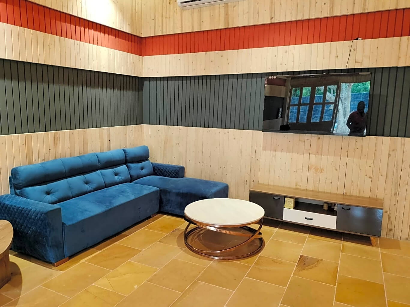 The comfortable living area is with comfortable sofas, flat big TV and Dinning Table with chairs.