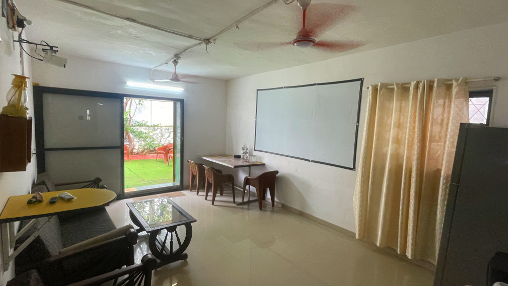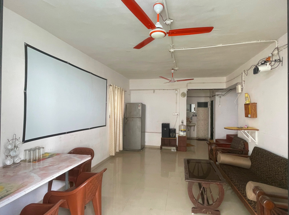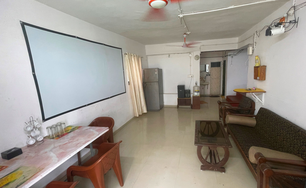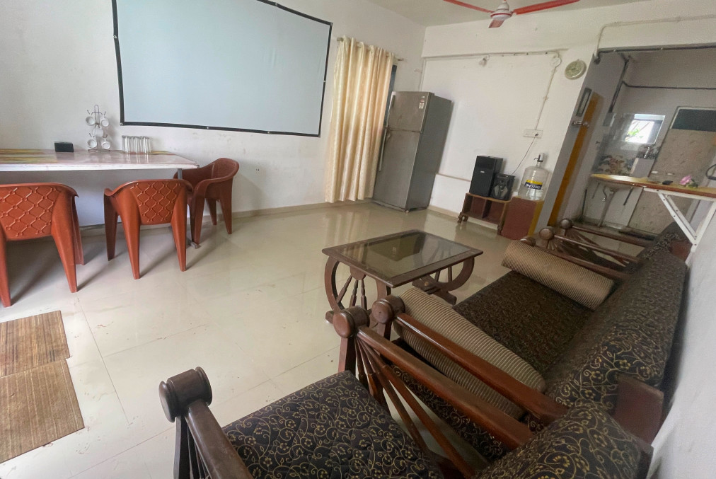 Living Room | Plenty of seating with sofa, mini bar setup, bluetooth speaker, home projector and dinning table. |