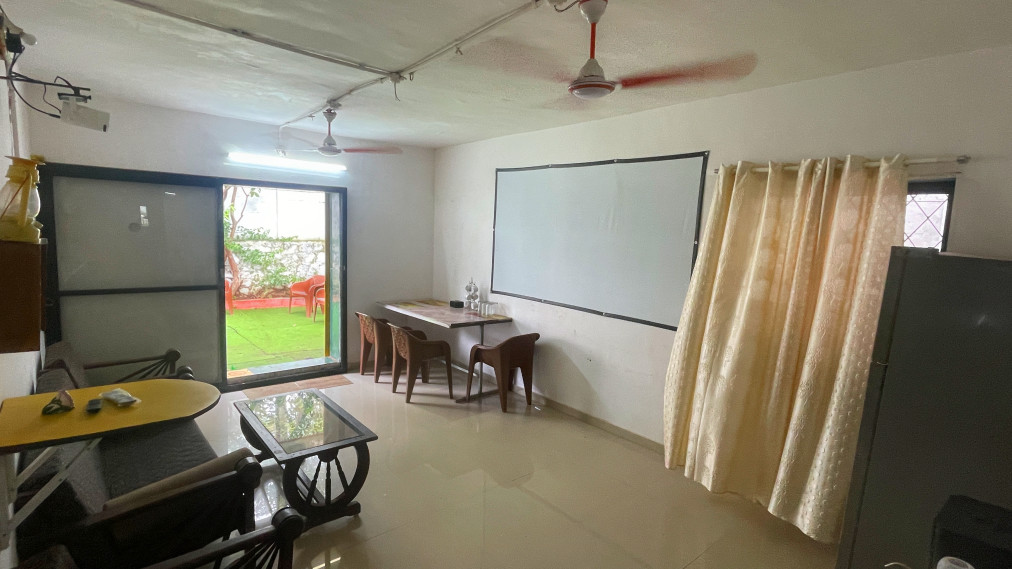 The comfortable living area is with sofa and center piece with bar arrangement. Dinning table with chairs, bluetooth speaker and home projector add to the party ambience.